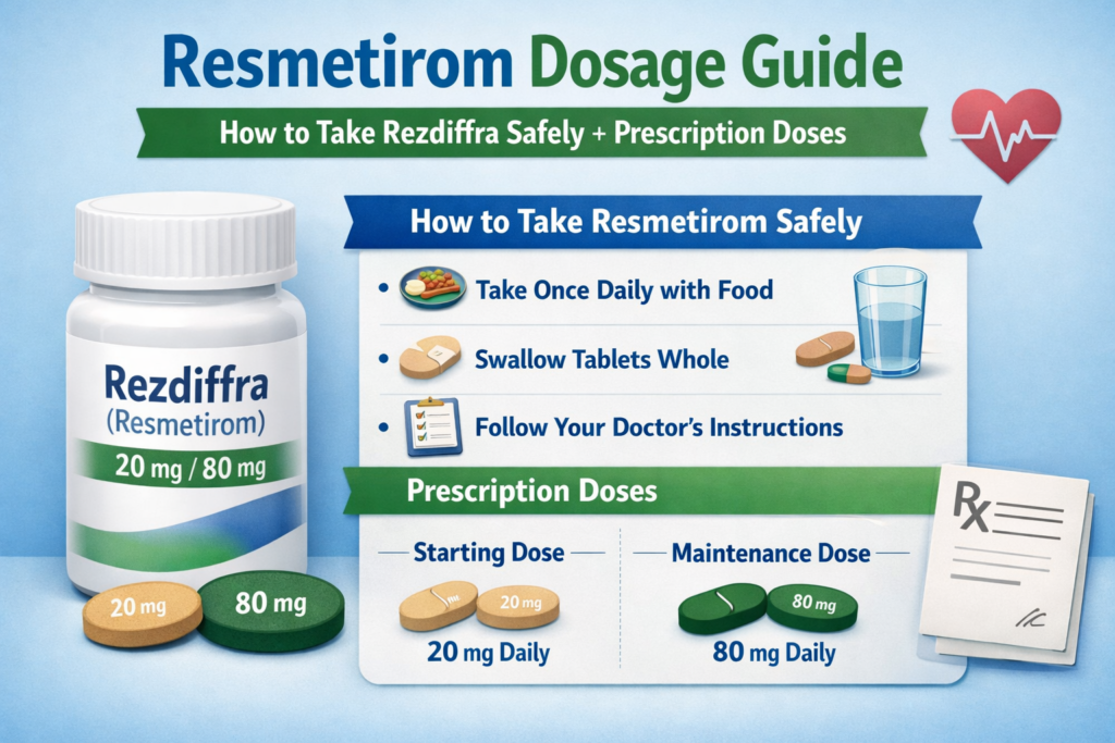 Resmetirom, sold under the brand name Rezdiffra, is the first FDA-approved oral treatment for adults with MASH (metabolic dysfunction-associated steatohepatitis) with moderate to advanced liver fibrosis. If you are searching for the correct resmetirom dosage, how to take it safely, and what dose your doctor may prescribe, this complete guide covers everything in simple terms.